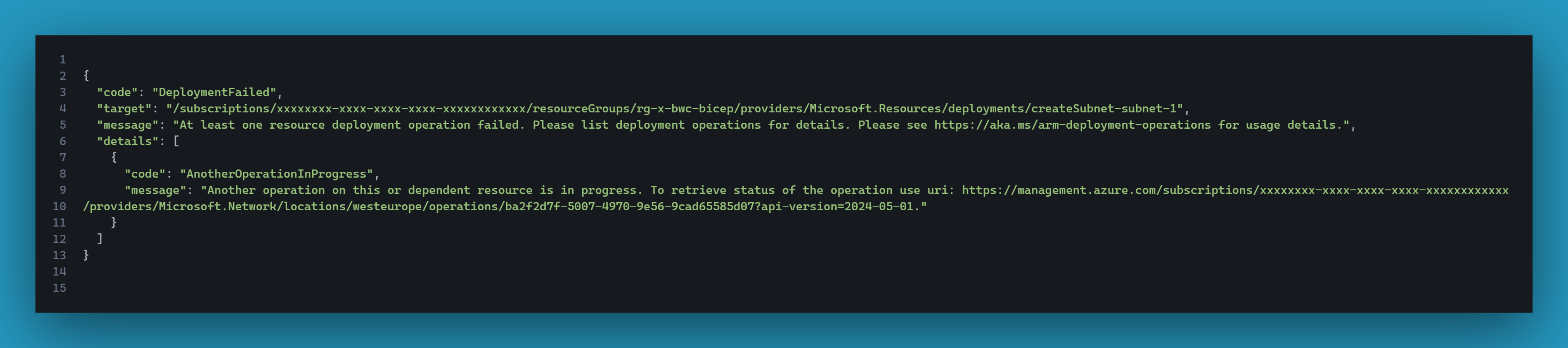 Each subnet creation updates the parent VNet’s metadata — and Azure only allows one update at a time. When ARM tries to deploy them all together, it collides with itself.